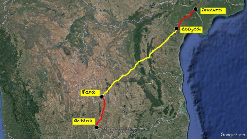 From Vijayawada to Muppavaram in Bapatla district, and from Kodikonda in Sri Sathya Sai district to Bengaluru, existing highways will be utilized.